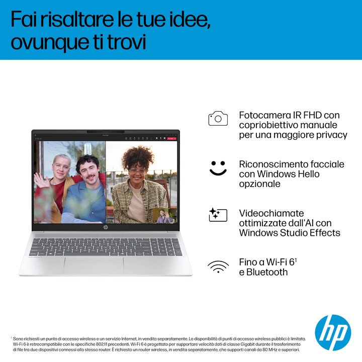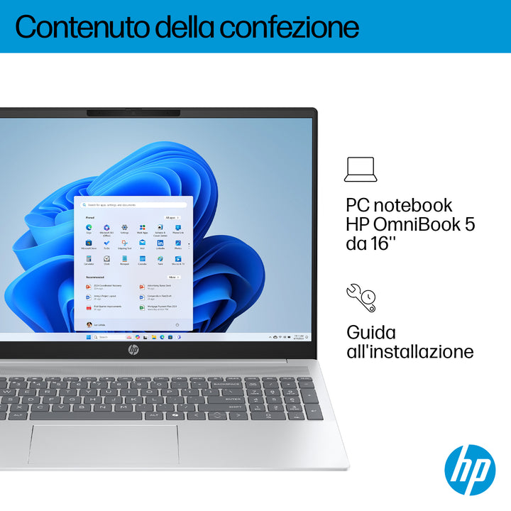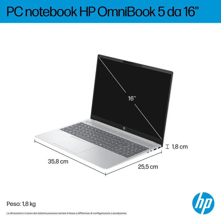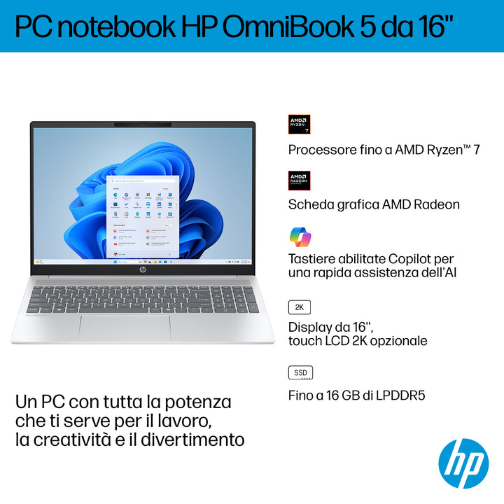 HP OmniBook 5 16-bc1000nl AMD Ryzen™ 5 8540U Computer portatile 40,6 cm (16") 2K 16 GB LPDDR5-SDRAM 512 GB SSD Wi-Fi 6 (802.11ax) Windows 11 Home Argento