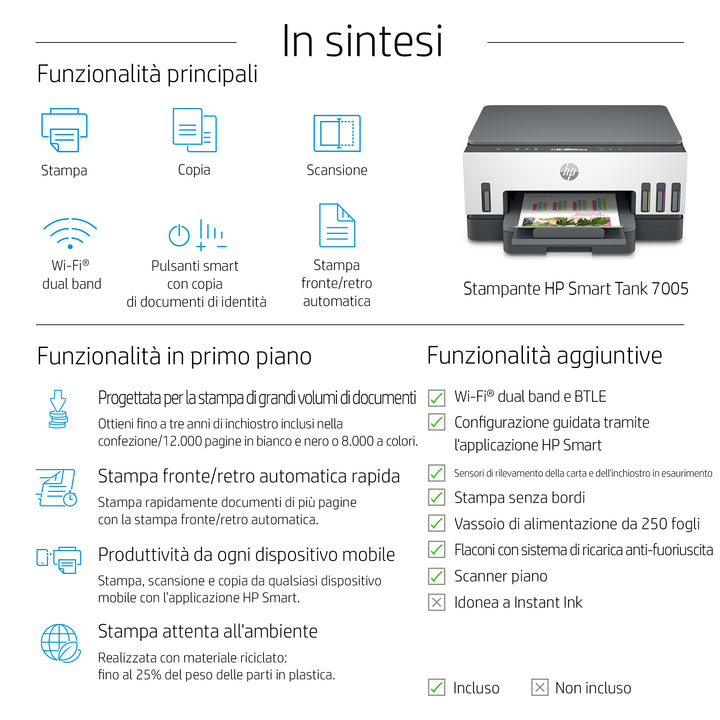 HP Smart Tank 7005 Wireless All-in-One Colore Stampante, Stampa fronte/retro; fotocopiatrice, scanner