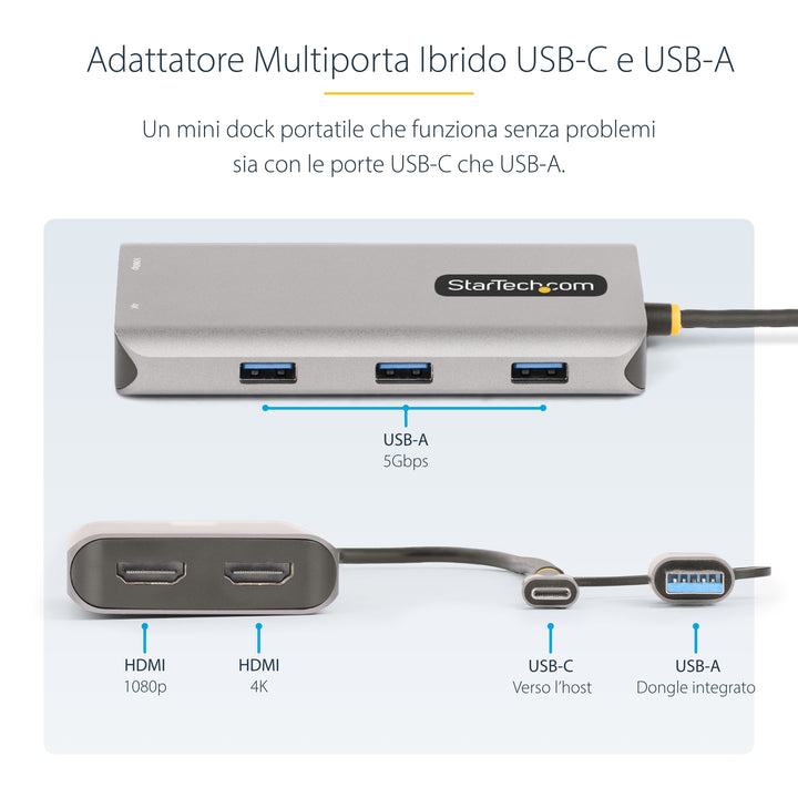 StarTech.com Adattatore multiporta USB-C con dongle USB-C a USB-A, doppio HDMI (4K30Hz/1080p60Hz), Hub USB-A 5Gbps a 3 porte, mini dock da viaggio, docking station USB tipo C per laptop, Cavo da 40 cm