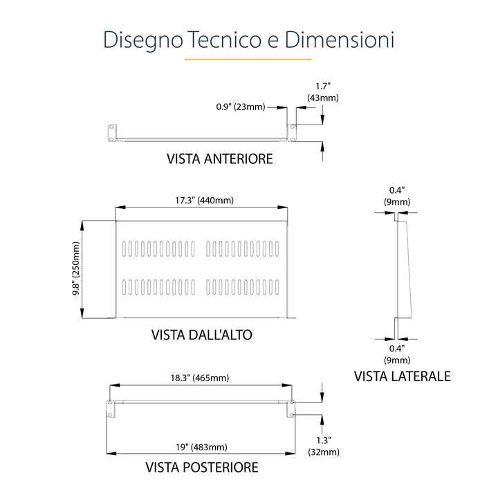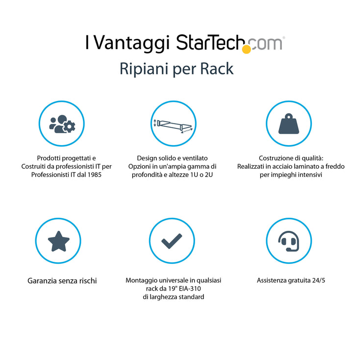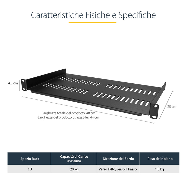 StarTech.com Ripiano Rack 19" 2U - Mensola Universale ventilata per rack e armadi di Rete da 19 pollici - Scaffale in Acciaio resistente - Capacità di peso 20kg - Profondità 25 cm - Nero