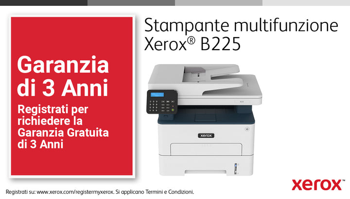Xerox B225 A4 34 ppm Copia/Stampa/Scansione wireless con stampa fronte/retro PS3 PCL5e/6 ADF 2 vassoi Totale 251 fogli